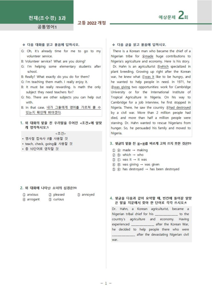 [구미 도량 원호 문성 고등학생 잘가르치는 영어학원]2025년 공통영어1 YBM(김은형)_4과 변형문제 예상...