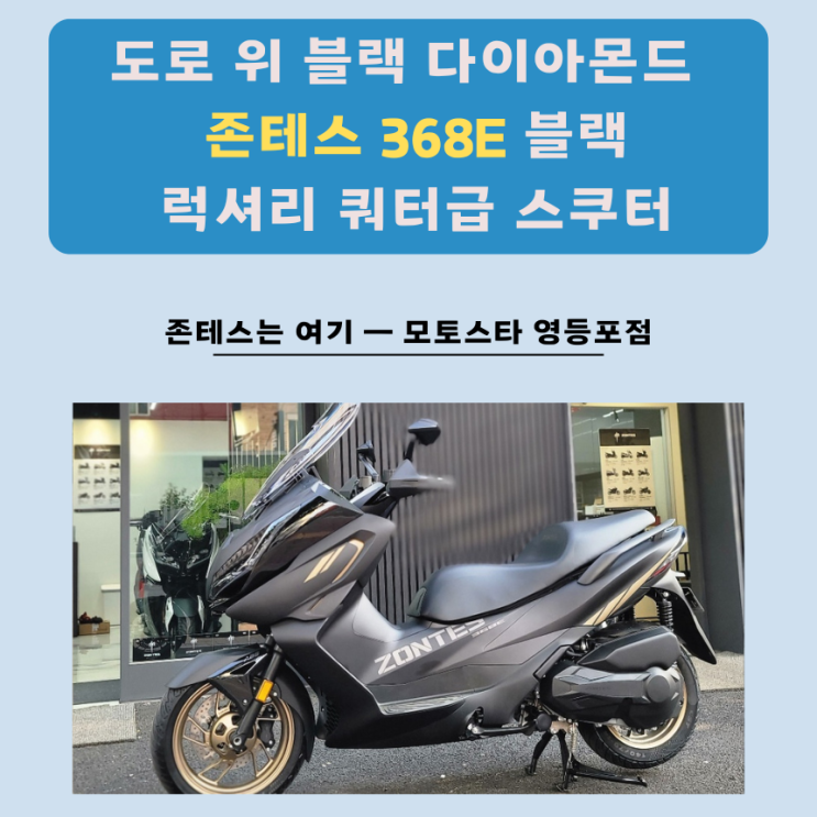 여기는 모토스타 영등포점 에스씨 바이크입니다. 오늘은 존테스의 럭셔리 쿼터급 스쿠터, 존테스 368E 블...
