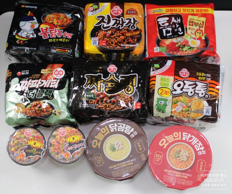 WOW고기열라면,새우진짬뽕,오늘의 닭곰탕/닭개장,불닭볶음면,틈새라면 빨계떡,진짜장,짜슐랭,오동통면,콩국수라면,마열라면,짜파게티 더블랙 구매/ 2025.07.21/피키의 라면 창고