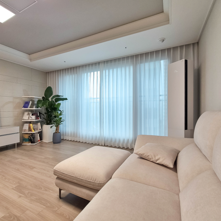 광진고, 용산구 여름철 커튼 트렌드 거실 도톰 쉬폰 + 서재 화이트 우드 블라인드 여름이 오면 창문 너머로...