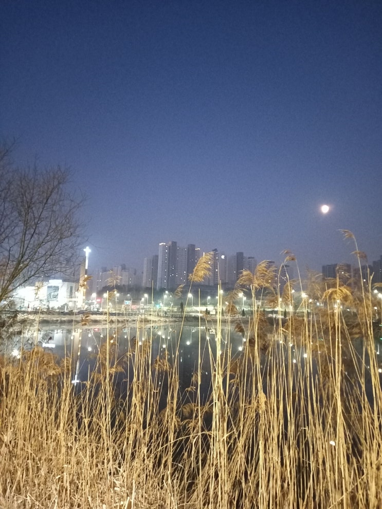 오늘은 날씨가 화창해서 서쪽 하늘에 떠있는 달이 환하게 보이고 교회 십자가 하얀색 불빛도 오늘 따라 유...
