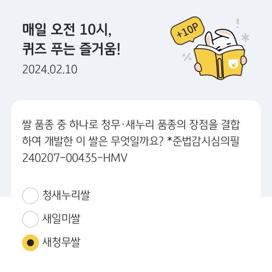 KB Pay 오늘의퀴즈 2월10일 쌀 품종 중 하나로 청무 새누리 품종의 장점을 결합하여 개발한 이 쌀은 무엇일까요 *준법감시심의필240207-00435-HMV