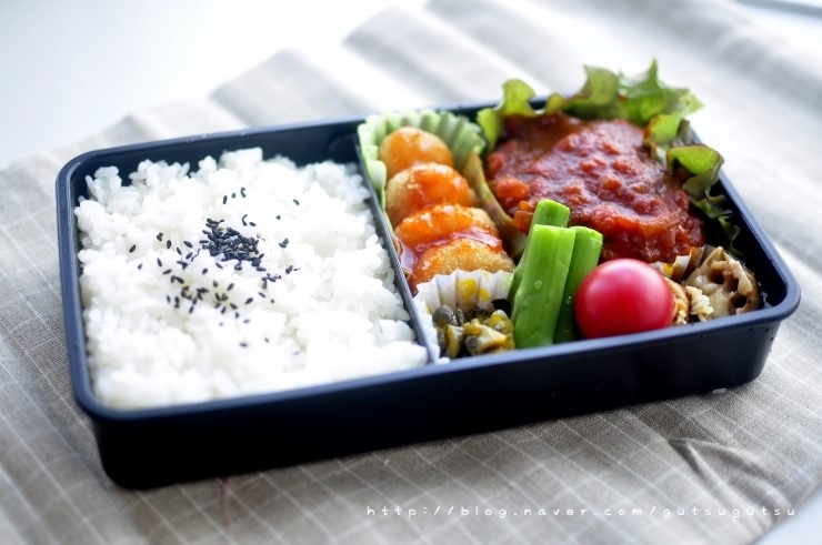 5월 14일 신랑 도시락입니다.   이 날은 햄버그 스테이크인데 양파를 갈아서 간...