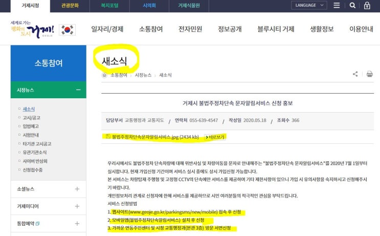 거제시 주정차단속 휴대폰 문자 알림서비스 실시
