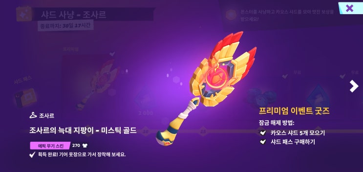 mo.co 샤드 사냥 조사르 패스 미스틱 골드 무기 스킨