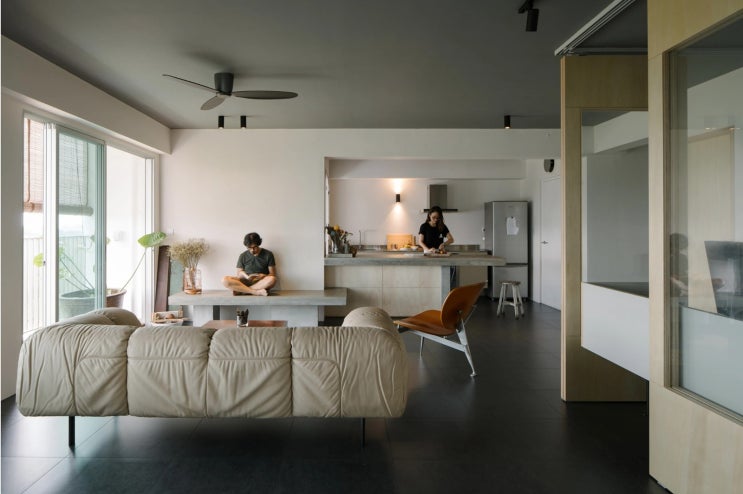 블랙 실링팬 거실 바닥 타일 시공으로 시크한 무드 완성