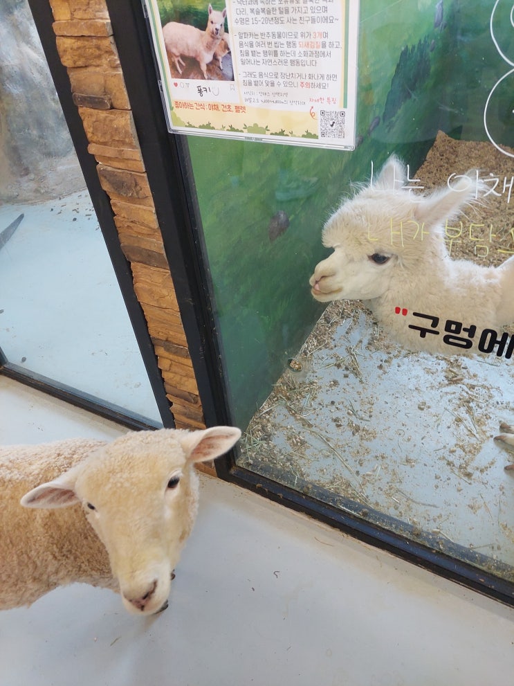 #수달앤쥬 두번째방문했어요. 수달앤쥬의 대표주인 알파카 퐁피. 바구니안의 먹이를 넘 막 먹어되서 갇혔네...
