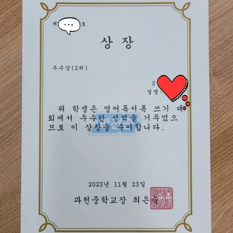 과천중영어 독서록 쓰기 우수상 내손동 영어학원 뮤엠영어 센트럴학원입니다. 이번주부터 중학교 기말고사 ...