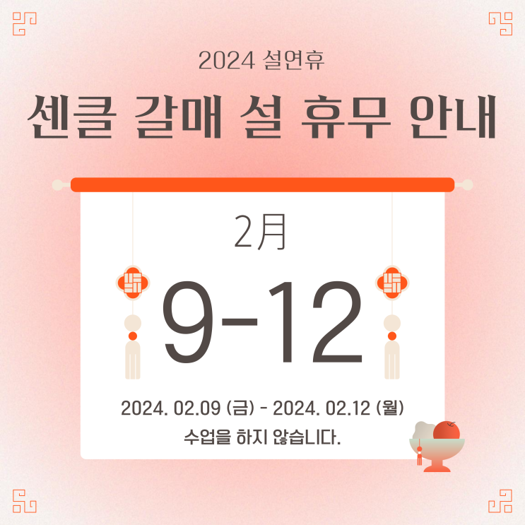 센클영어도서관 설 명절 휴무 안내 2024년 2월 9일 금요일부터 2024년 2월 12일 월요일까지 설 명절에 수업...