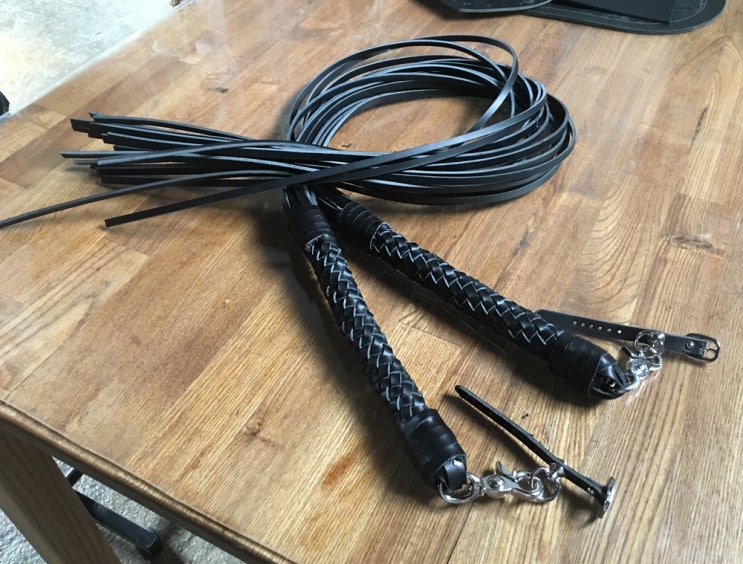 각종 장식으로 활용할 수 있는 통가죽 채찍입니다. 핸들에 장착하는 모델로 채찍 그립부분 지름 4센티의 중...