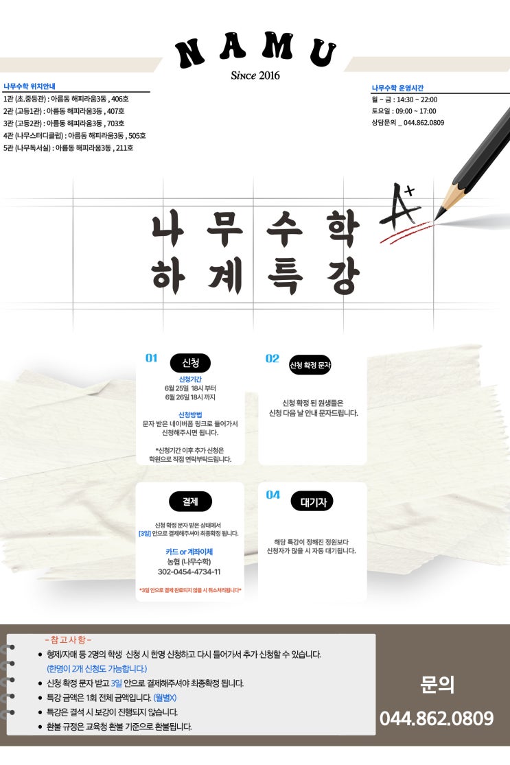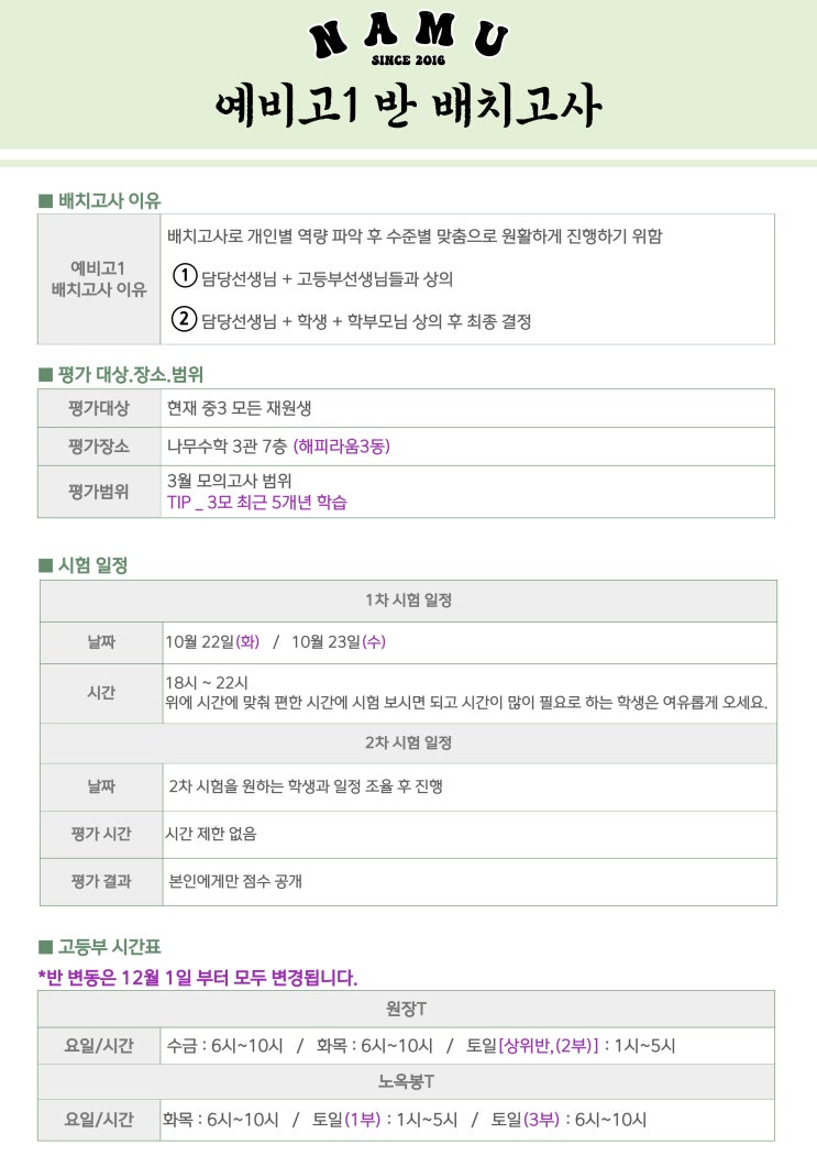 안녕하세요, 나무수학 입니다. 현 중3(예비고1) 학생들 반 배치고사 안내드리오니 상단 이미지를 참고해 주...