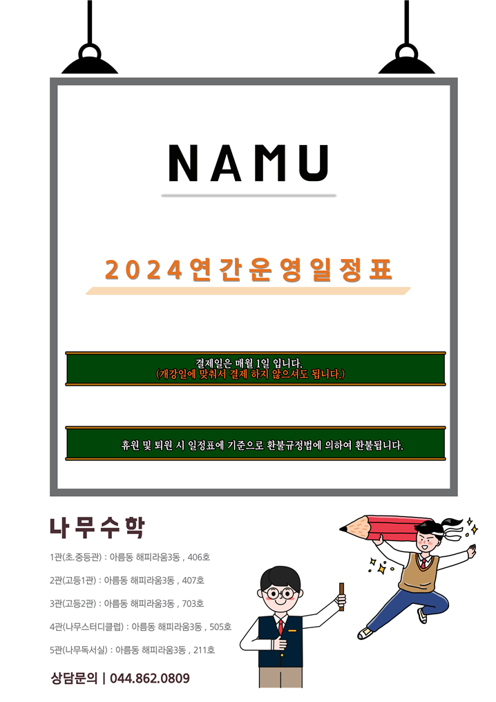 안녕하세요, 나무수학 입니다. 24년 12월부터 25년 2월까지의 연간 운영 일정표를 안내드립니다. 일정표의 ...