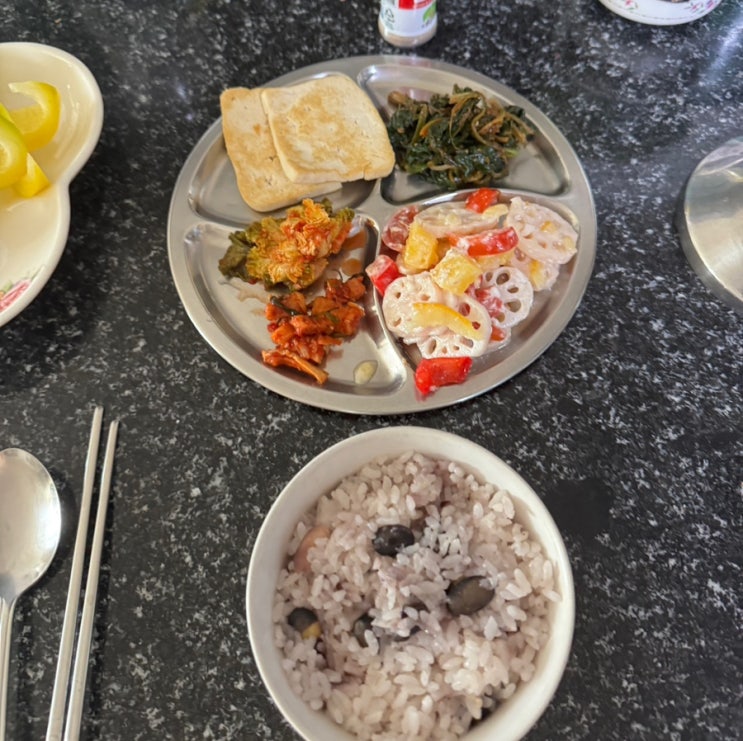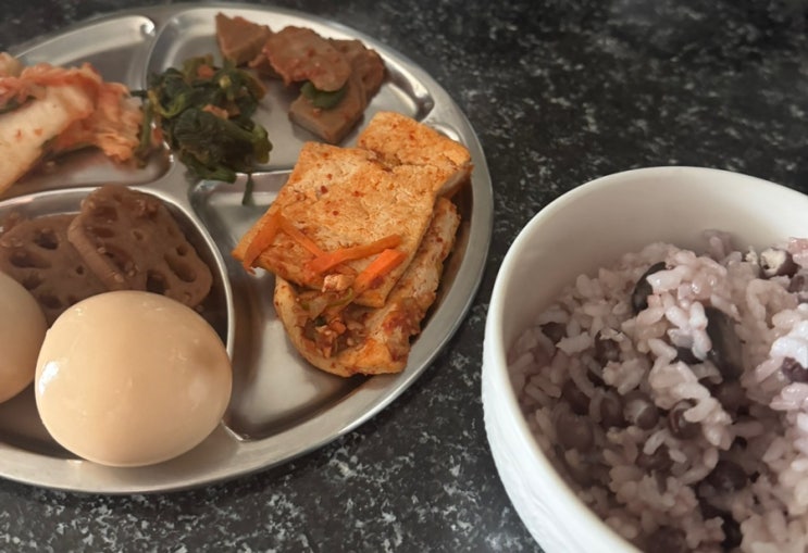 섭취한 것 -구운 계란 2개, 두부조림, 묵, 시금치, 연근조림, 김치, 비지찌개, 팥밥 -미니크로와상, 떡 남...