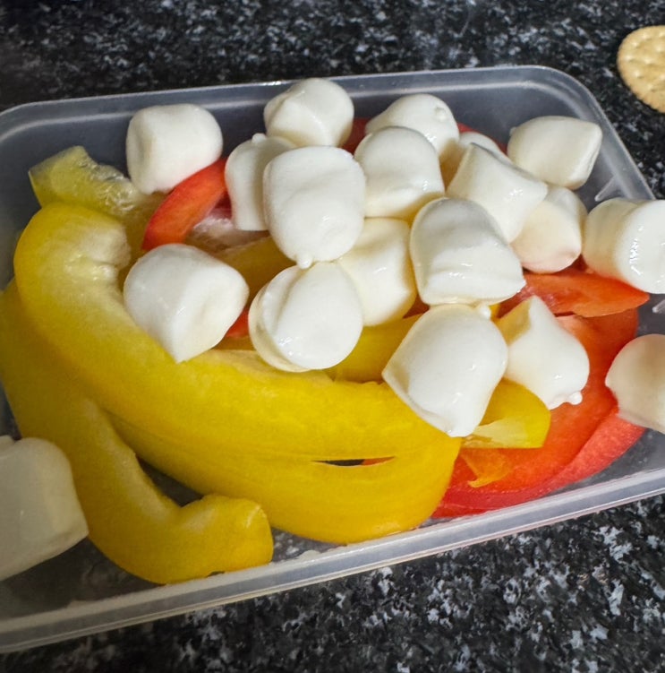 섭취한 것 -파프리카 모차렐라, 크림치즈+크래커, 바나나 -먼투썬 견과, 코코아 -파프리카, 방토, 김볶+치...