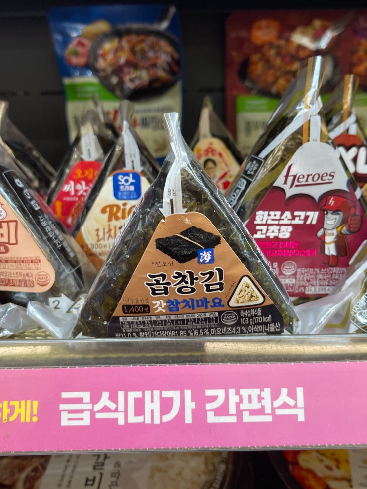 CU편의점 삼각김밥 코너를 둘러보다가 신상품 곱창김 갓참치마요를 발견했어요. 갓이 들어간 삼각김밥은 ...