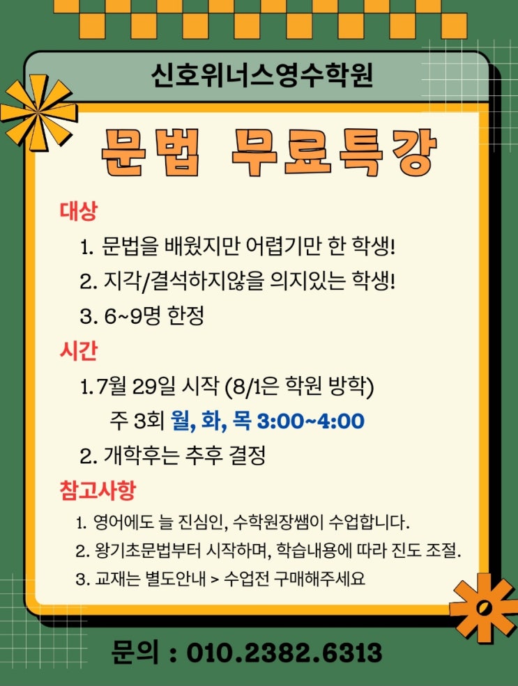 신호동 영수학원 신호위너스영수학원입니다. 신호중학교 방학이 시작되기전 중등대상 문법무료특강을 결심...