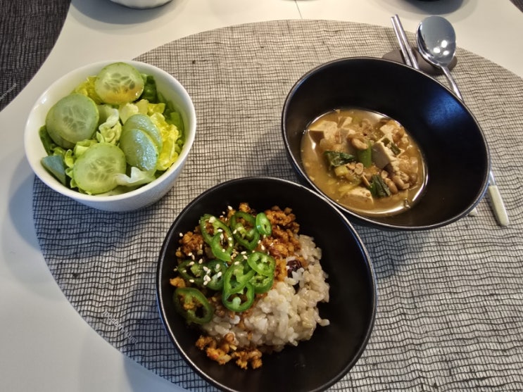 서울 딸 집에서 아침을 먹었다. 볶은 소고기덮밥에 슴슴하고 구수한 깊은맛의 된장찌게렁 샬러드 건강한 아...