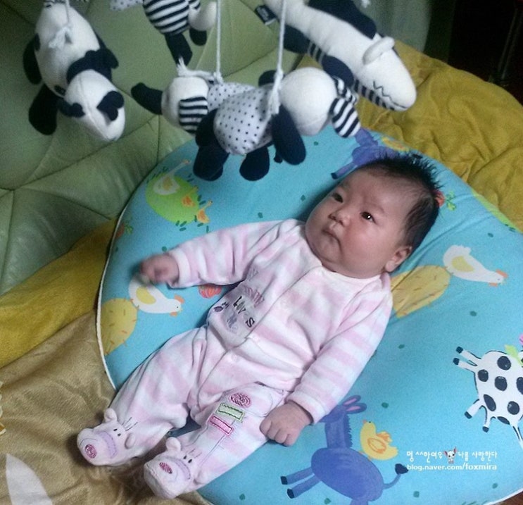 모빌 보는 시간이 점점 길어지고 있어요. 처음에는 30초도 관심을 못 받던 모빌이 이젠 제 몫을 하...