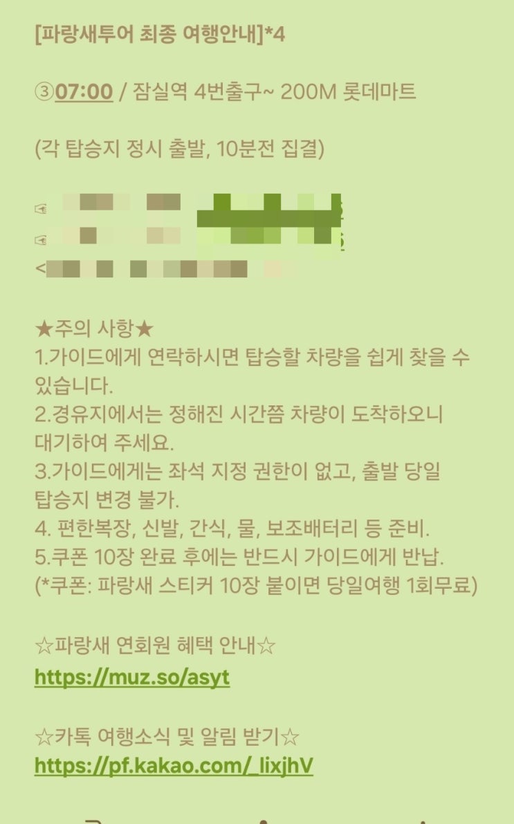 파랑새투어 라는 버스 여행이 있다. 당일치기는 물론이고 1박2일 여행, 제주도, 해외여행도 하는 것 같던데...