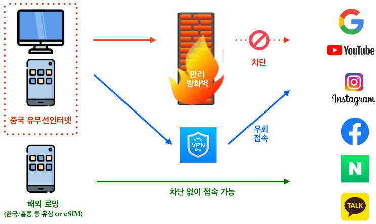 로밍 : 전화, 문자 가능 - 비용, 인터넷 사용 유심칩(말톡) 포켓 와이파이 중국은 vpn(아이피 우회)이 필요...