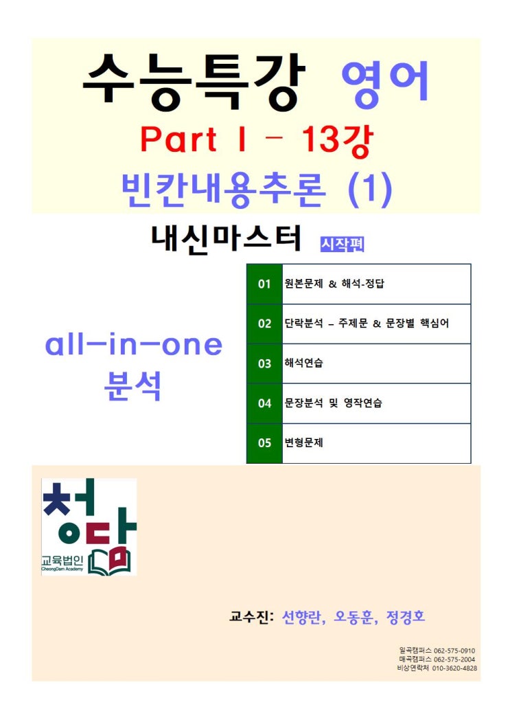 안녕하세요. 수험생 그리고 선생님 여러분 !! 청담아카데미 학원 영어과 원장 오동훈 입니다. 작년 수능특...