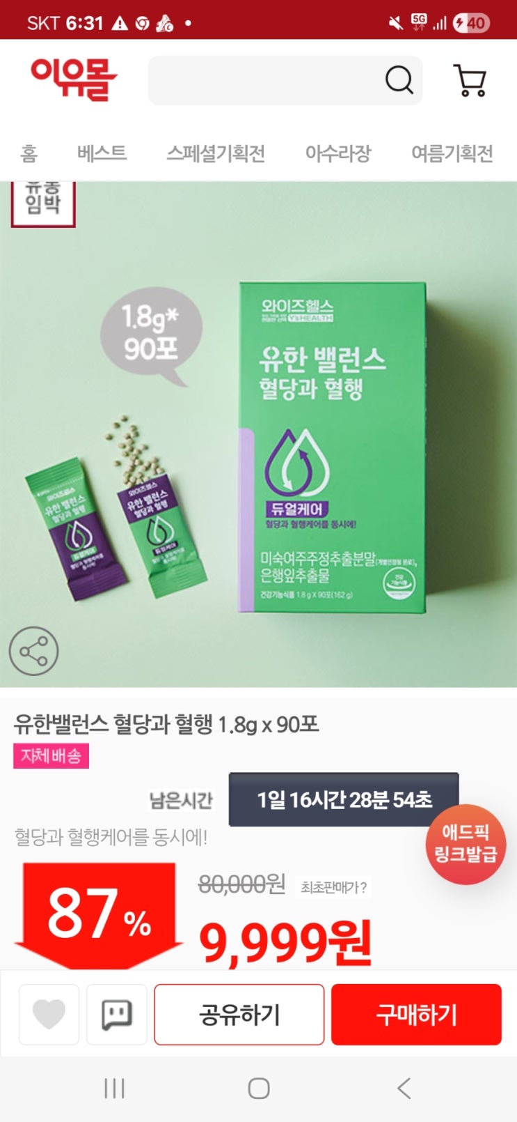 유한밸런스 혈당과 혈행 1.8g x 90포 9999원