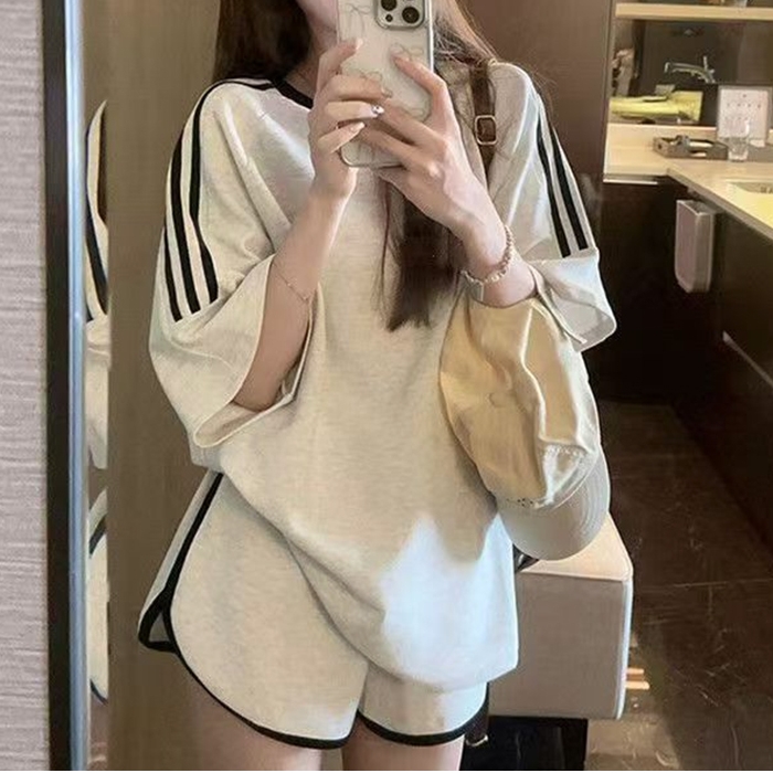 루즈핏 배색 라인 여성 주니어 상하세트 여름 트레이닝 반팔 반바지 숏팬츠 헬스 운동복 투피스