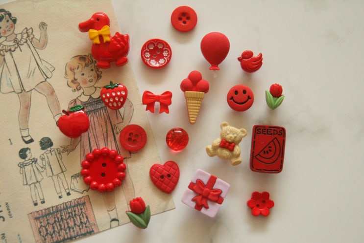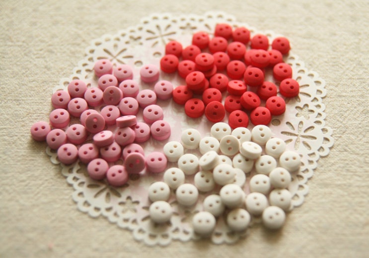 귀여운 미니 사이즈의 라운드 단추들. 같은 회사의 같은 색상을 입고했는데, 레드가 너무 밝은것이 왔네요....
