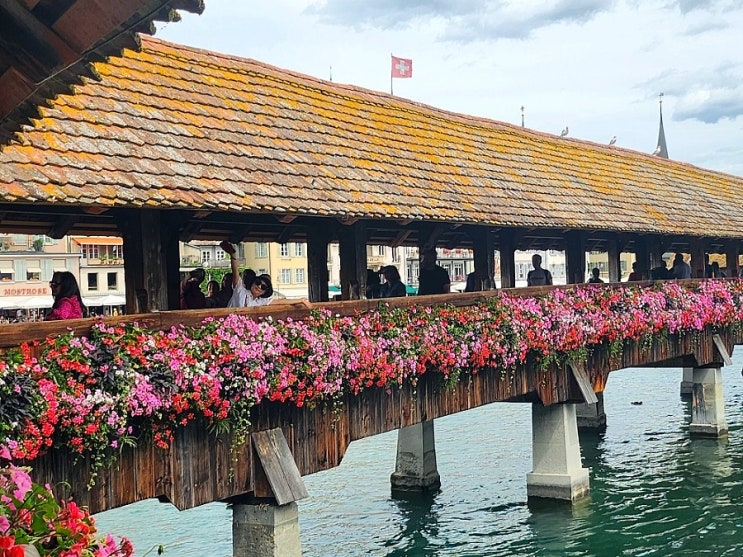 스위스 도착 첫날 취리히에서 스위스패스로 기차타고 루체른역에 도착해서 100년이상된 목조다리인 카펠교...
