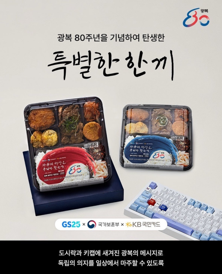 광복80주년을 기념해서 GS25x국가보훈부xKB국민카드가 콜라보로 7첩반상 도시락을 내놨더라구여. 키캡...