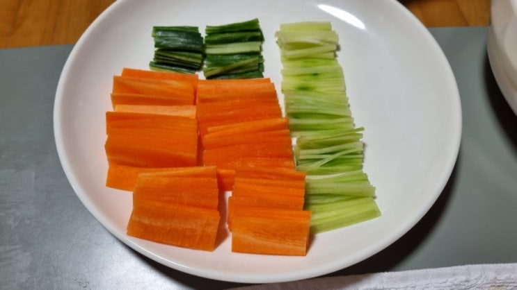 시작은 언제나 따봉과 함께 오늘의 메뉴는 무생채와 칠절판이다 재료준비 완료 칠절판 석이버섯은 불려서 ...
