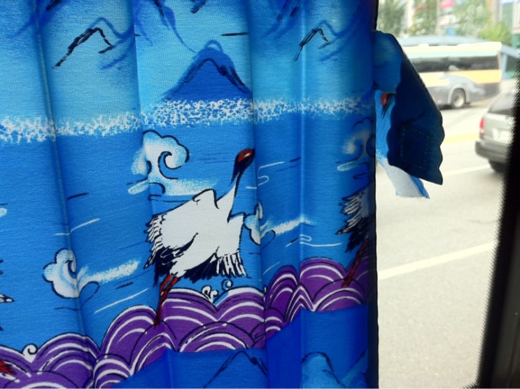 어울리지 않는 학 그림이 그려져있는 셔틀 버스 안이지...