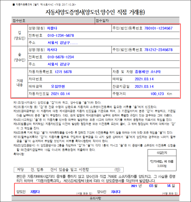 차량 이전등록 방법 (양도인, 양수인 직접 방문)