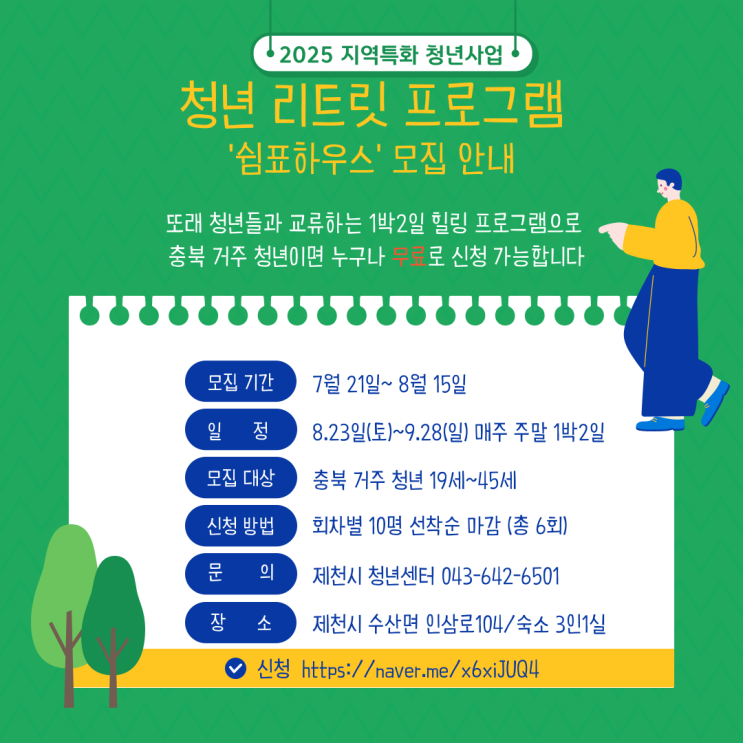 제천 청년 무료 1박2일 힐링 프로그램 '쉼표하우스'모집