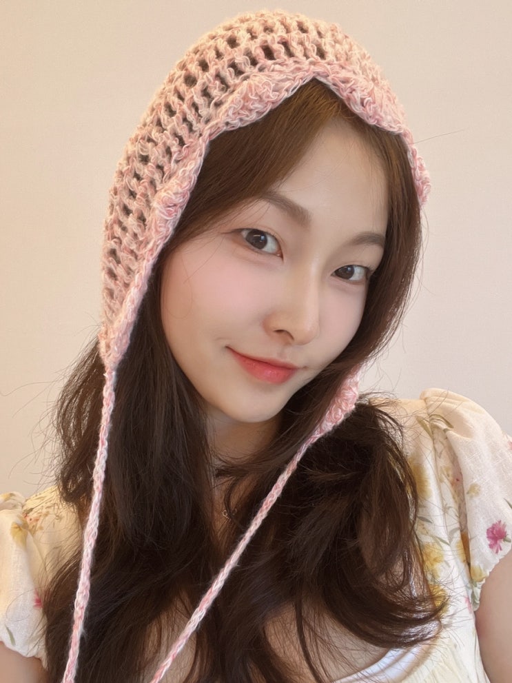 핸드메이드뜨개용품 감성 가득한 연핑크 니트비니, knitneed 꽃가라비니 요즘 날씨가 딱, 예쁘게 입고 사진...