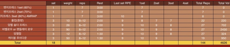 오늘의 운동 루틴이다~ 가장 안 느는 벤치 프레스를 진행! 진짜 벤치랑 OHP는 무게가 정말 안 는다.. 인...