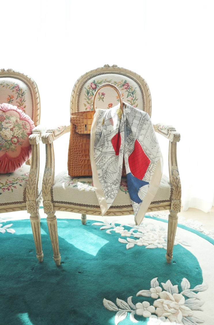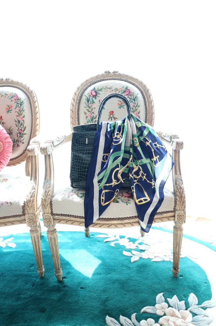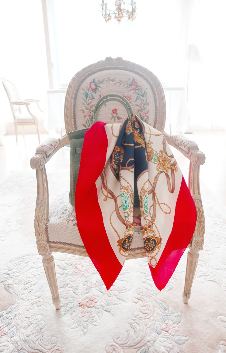 1.레드네이비 골드 실크스카프 made in 프랑스, 레드 컬러라인과 아이보리 컬러바탕에 레드, 골드, 그린 브...