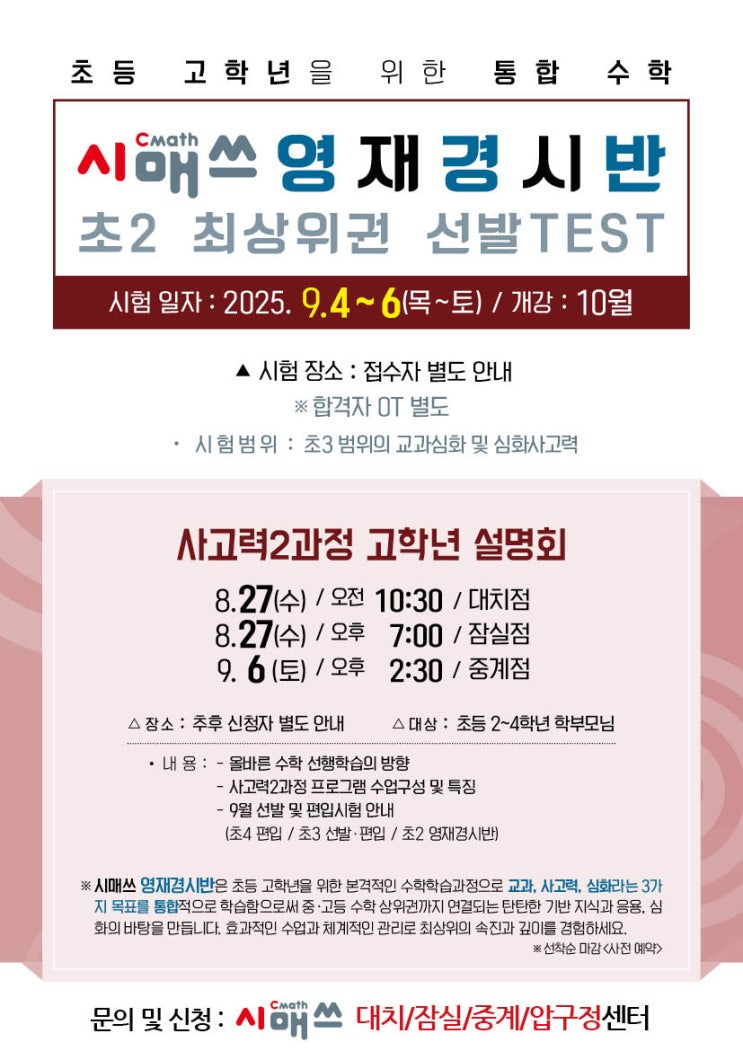 시매쓰 대치, 잠실, 중계점 초2 영재경시반 선발, 설명회(초2~4)
