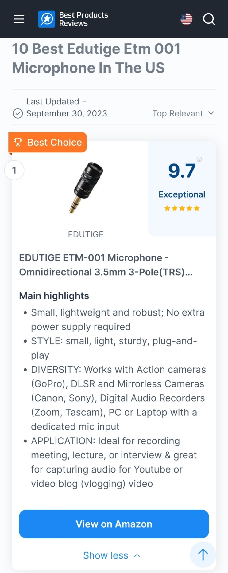 미국 BestProductsReviews.com 에서 에듀티지 ETM-001 마이크가 1등 먹었습니다!