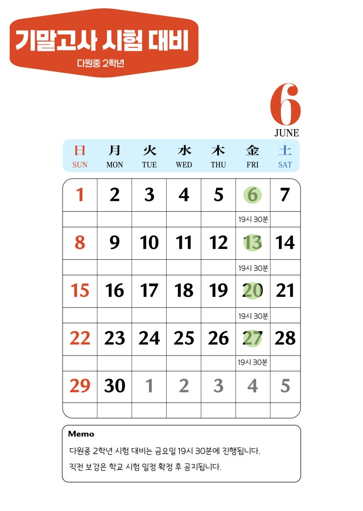 [뿌리깊은독해] 중등 1학기 기말고사 내신대비 시간표