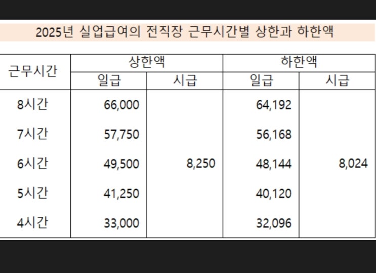 실업급여액은 (240만 + 129만) / 41일 = 90000원 90000원 × 60프로 = 54000원(일급) 소정근로시간 반...