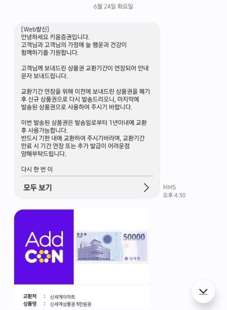 렉 보상으로 5만원 상품권 받고 사용은 안하고 있었는데 키움에서 기간연장 상품권을 보내주었다 유효기간 ...