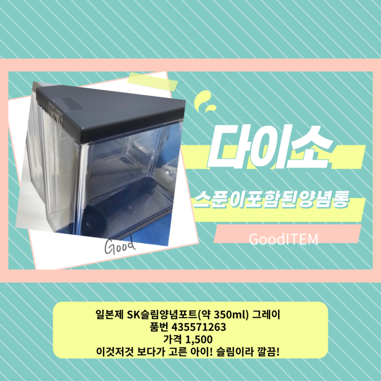 [다이소용품]다이소주방용품 스푼이 포함된 슬림 양념통 품번435571263 가격 1500원 슬림해서 쏙!