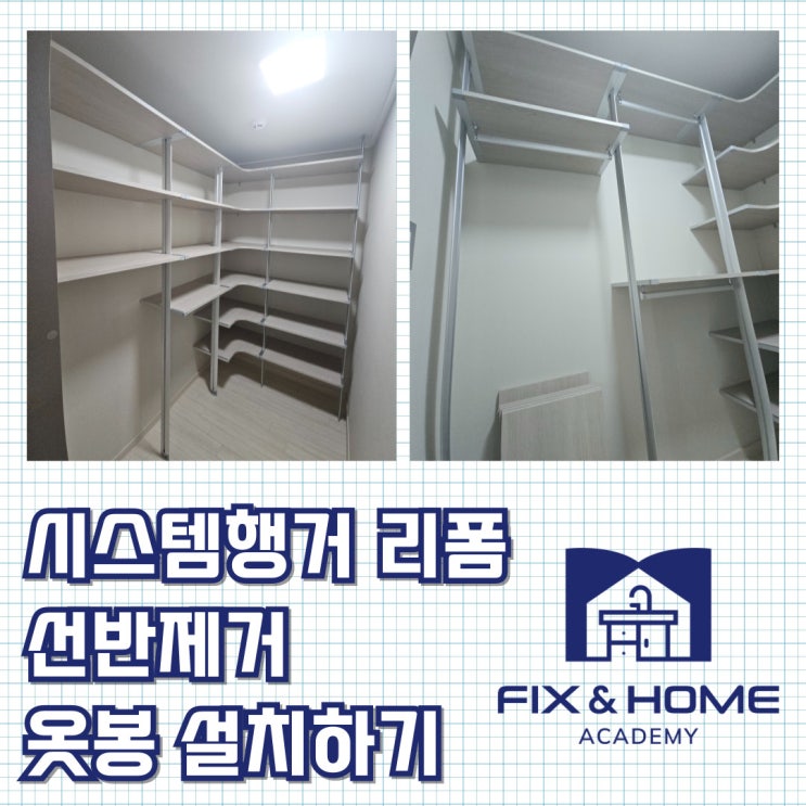 시스템행거 리폼 : 시스템행거 선반제거 옷봉 시공 드레스룸에 설치되어있는 시스템행거! 선반형으로 되어...