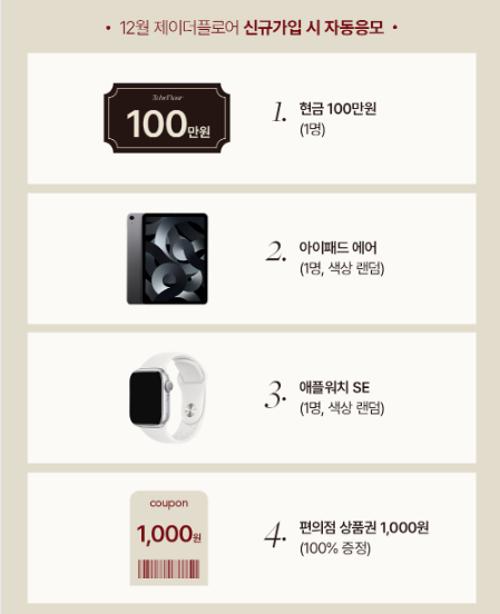 [현금 100만원, 아이패드 에어, 애플워치 SE, 편의점 상품권 1천원(전원지급)] 무료 경품 응모 추첨 이벤트 JtF