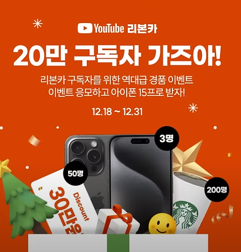 리본카 유튜브 채널에서 진행하는 무료 경품 이벤트입니다. 응모방법 : 유튜브 구독, 어플 다운, 폼작성 경...