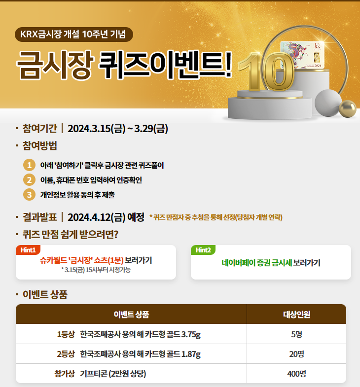 [금 0.5돈, 금 1돈, 기프티콘 2만원] 무료 경품 응모 추첨 이벤트 KRX금시장