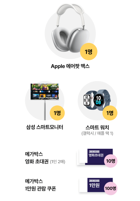 [에어팟 맥스, 삼성 스마트모니터, 스마트워치, 메가박스 영화권, 할인 쿠폰] 무료 경품 응모 추첨 이벤트 키노라이츠