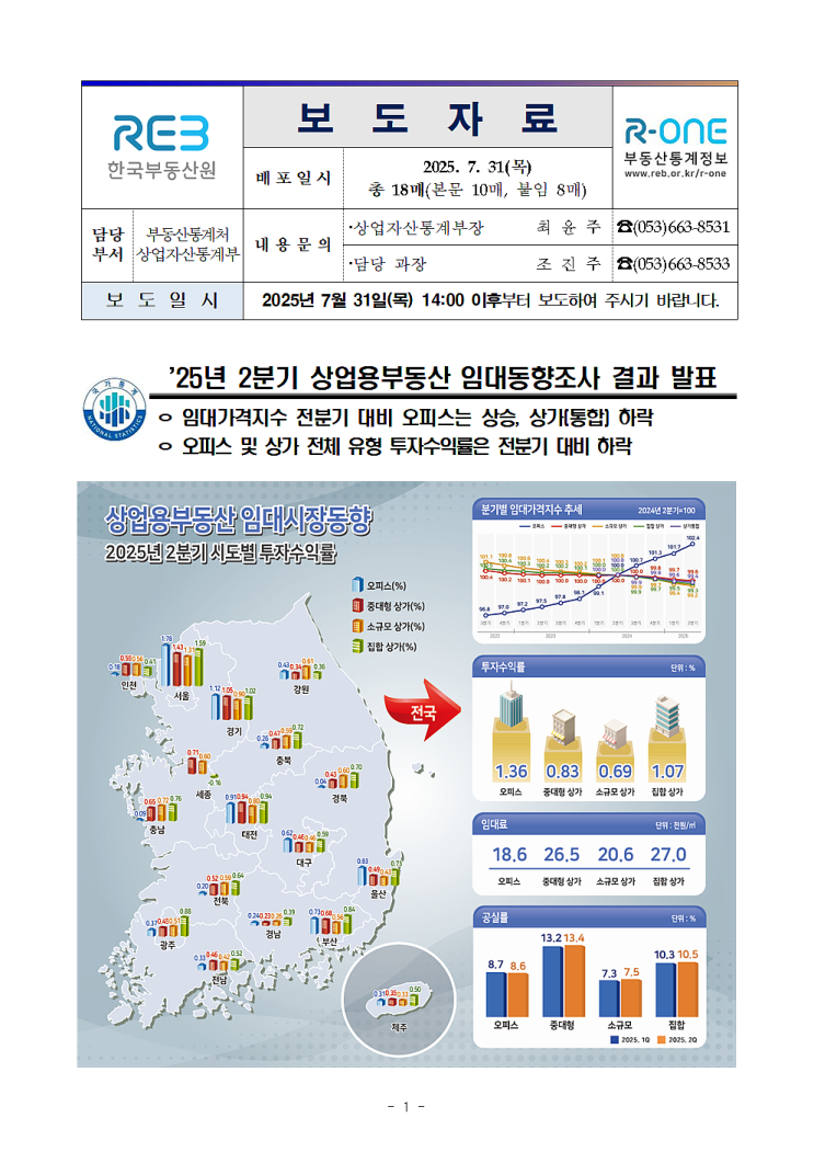 한국부동산원이 전국 상업용부동산에 대한 2025년 2분기(6.30.기준) 임대가격지수, 임대료, 투자수익률, 공...