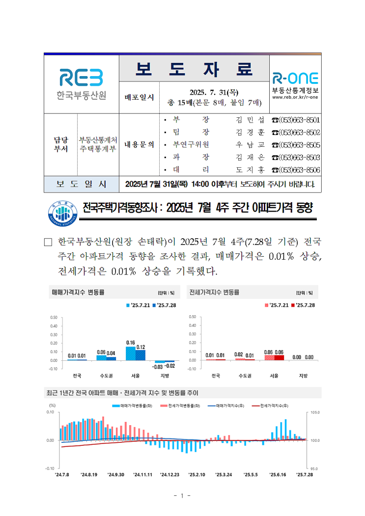 2025년 7월 4주 2025.7.28.기준 주간 아파트가격동향 확인하세요! by 한국부동산원 매매가격 상승【0.01%】...